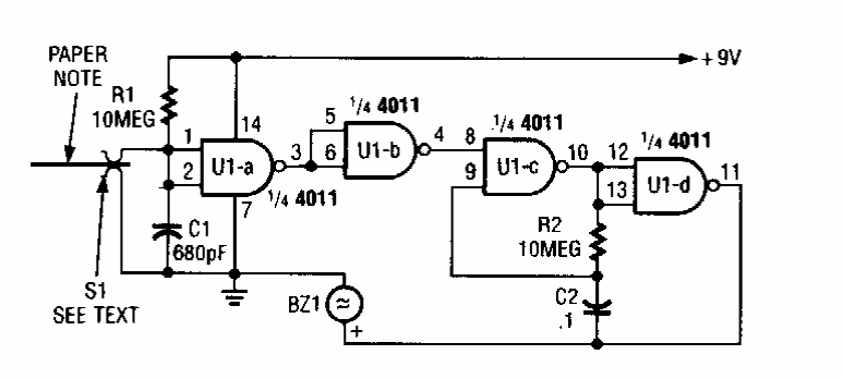 O que este interessante circuito faz é avisar que uma nota escrita num papel foi retirada e lida, acionando um circuito de aviso com um buzzer intermitente. O circuito é de uma Popular Electronics dos anos 90.