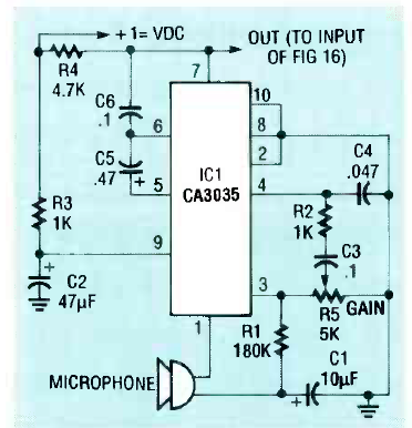 Este preamplificador para microfone pode ser usada em diversas aplicações. O circuito é de uma Radio Electronics de julho de 1990. Observe a baixa tensão de alimentação.