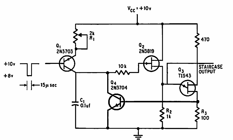 Este circuito foi encontrado numa documentação americana de 1968. O circuito gera sinais em forma de escada ajustados em um potenciômetro. Transistores equivalentes podem ser utilizados.
