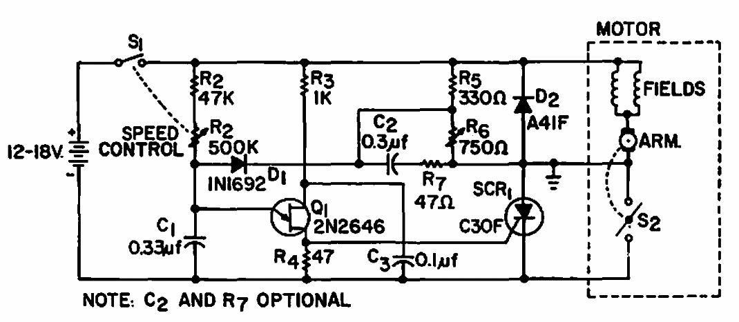 Este circuito foi encontrado em documentação da General Electric de 1965. Ele se destina a motores com escova de baixa tensão. O SCR deve ser de acordo com o motor controlado.