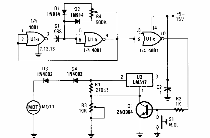 Esta configuração de controle PWM com o LM317 foi encontrada numa Popular Electronics dos anos 90. O circuito usa componentes ainda comuns. Para o LM317 a corrente máxima é 1,5 A. Pode ser usado o LM350 para 3 A.
