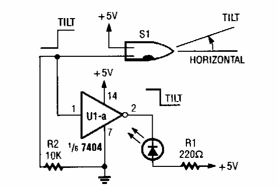 Este circuito acende um LED de aviso (tilt) quando um dispositivo em que se encontra a chave de mercúrio é agitado ou tem sua posição alterada. Encontramos numa Popular Electronics dos anos 90.