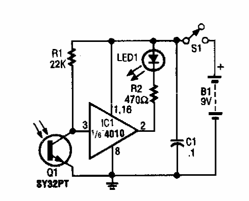 Este circuito de uma Electronics Now dos anos 90, usa uma porta do 4010 como amplificador para os sinais. O circuito aciona um LED indicador.
