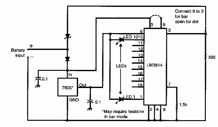Este circuito foi encontrado numa revista 73 de radioamadores dos anos 90. Um LED estende a escala de 0 a 5 V para 10 a 15 V neste circuito bargraph. Podem ser usados outros valores de zener.