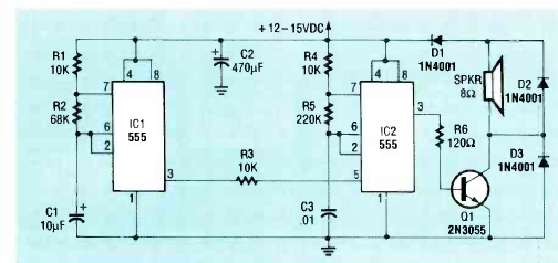 Encontramos este circuito para alarmes em uma revista Radio Electronics de julho de 1990. O transistor de potência deve ser dotado de dissipador de calor.