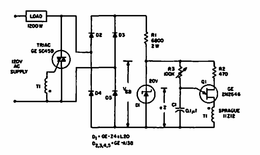 Este circuito foi encontrado num manual da General Electric de 1967. Ele mostra um controle de SCR com unijunção e diodo zener. O triac depende da carga controlada.