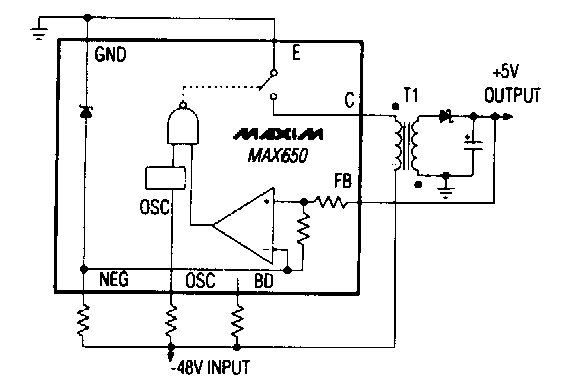 Encontrado numa documentação da Maxim dos anos 90, este circuito produz uma tensão de 5 V a partir de entrada de -48 V, por exemplo, como a encontrada em linhas telefônicas. A corrente de saída é de 250 mA.
