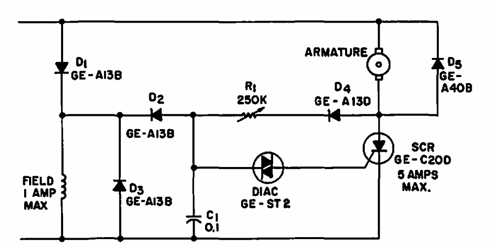 Encontrado em documentação técnica da General Electric de 1965 este circuito de meia onda controla motores do tipo shunt de 1 A no máximo com tensão de até 400 V.