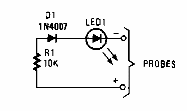 Este circuito para tensões de até uns 20 V foi encontrado numa Popular Electronics dos anos 90. O LED pode ser de qualquer tipo ou cor.