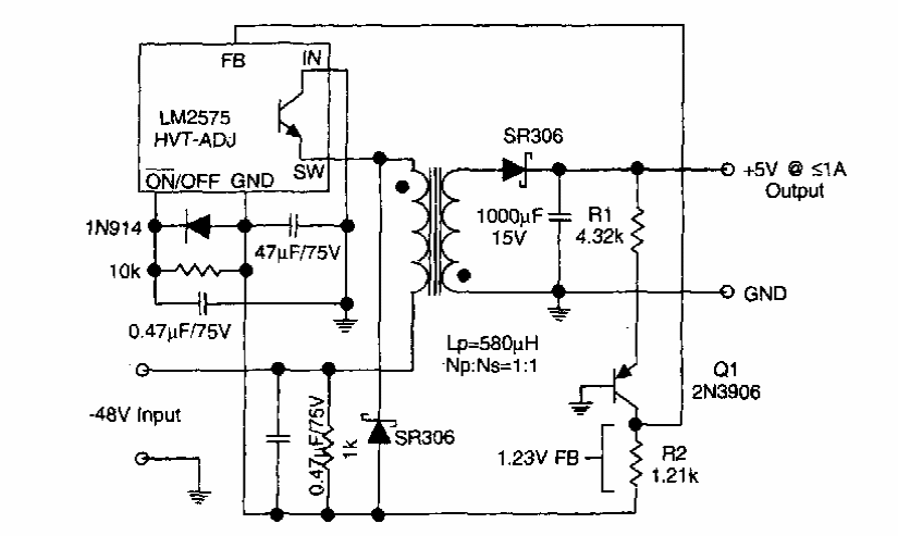 Este circuito para telecomunicações foi encontrado numa publicação da National Semiconductor dos anos 90. Ele se destina a conversão da tensão de 48 V de linhas telefônicas para 5 V com correntes até 1 A.