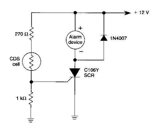 Encontrado numa documentação americana, este simples circuito ativa um buzzer com oscilador. Pode ser usado um relé e o resistor de 1M substituído por um potenciômetro de mesmo valor para se obter ajuste de sensibilidade.