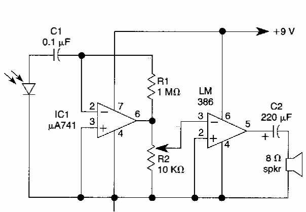 Este é o receptor para o circuito anterior. O amplificador de áudio admite equivalentes. O receptor é um fotodiodo operando como célula fotoelétrica. Pode ser usada em seu lugar uma fotocélula do tipo encontrado em calculadoras e relógios solares.