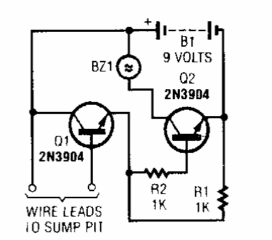 Este circuito é de uma Popular Electronics dos anos 90. Os transistores são de uso geral e o buzzer é do tipo Sonalert com oscilador.