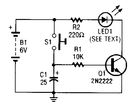 Este circuito mantem um LED aceso por alguns instantes quando S1 é pressionado. O tempo depende de C1. O circuito é de uma Popular Electronics dos anos 90.