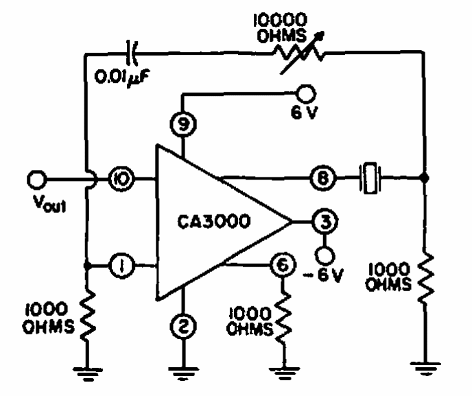 Este oscilador foi encontrado num manual de circuitos lineares da RCA dos anos 70. O oscilador faz uso de um integrado da época, difícil de encontrar atualmente.