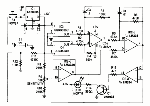 Este circuito foi encontrado na revista Radio Electronics de junho de 1991. O circuito usa dois sensores de efeito Hall da época. Pode ser montado com equivalentes modernos.