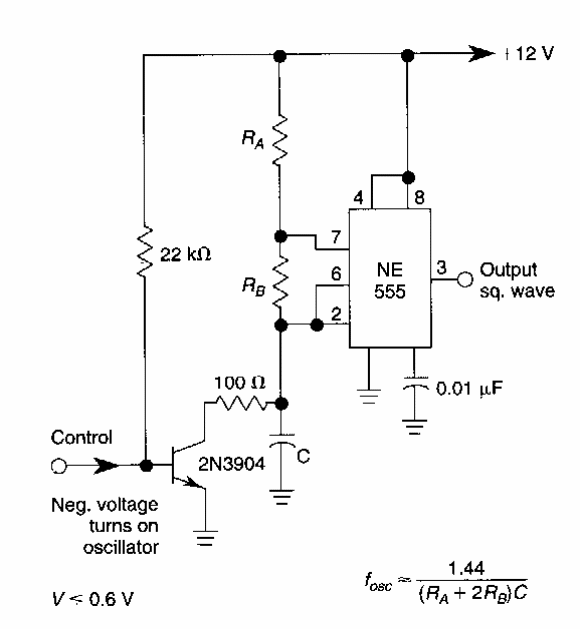 Este oscilador encontrado numa Electronics Now dos anos 90 é do tipo Normalmente-Desligado, sendo disparado por uma tensão negativa aplicada à base do transistor (aterrado).