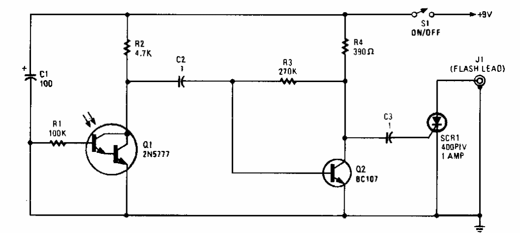 Encontrado numa Popular Electronics dos anos 90, este circuito se aplica a flashes com lâmpadas de xenônio. O transistor admite equivalente e o fototransistor é do tipo Darlington.