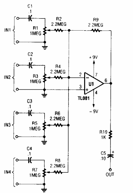 Esta configuração tradicional de mixer com alta impedância de entrada foi encontrada numa Popular Electronics dos anos 90. O operacional com JFET na entrada admite equivalente.