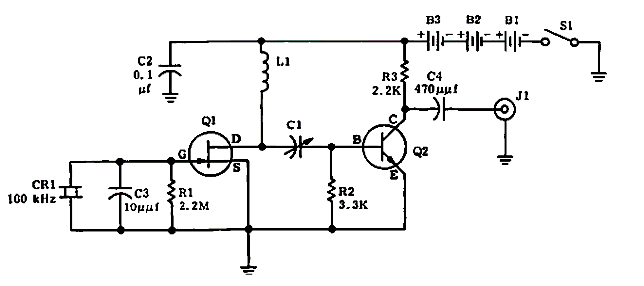 Este oscilador de 100 kHz, foi encontrado numa publicação da Motorola de 1966. Os transistores são de tipos apropriados para a frequência gerada e L1/C1 dependem dessa frequência.