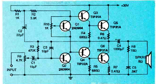 Encontramos este circuito de amplificador na revista Electronics Now de maio de 1994. Os transistores de potência devem ser dotados de bons dissipadores de calor.