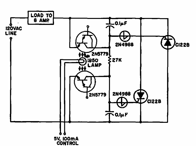 Encontrado em documentação da General Electric de 1969, este circuito usa dois Foto Darlingtons para controla as fases de condução de dois SCRs. Os SCRs podem ser tipos atuais equivalentes.