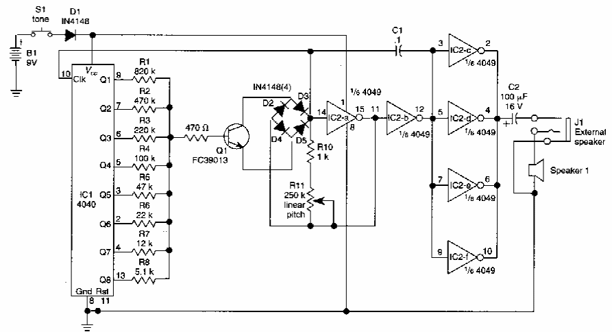 Encontrado num R-E Experimenters Handbook de 1989, este circuito produz diversos efeitos sonoros podendo ser modificado. O sinal deve ser aplicado a um amplificador externo.