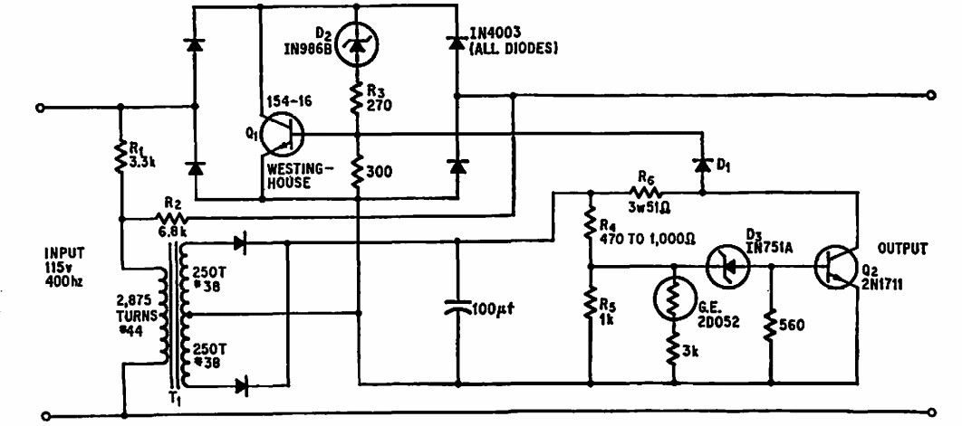 Encontramos este interessante circuito numa documentação americana de 1969. Ele mostra uma solução com transistores para limitação de surtos numa linha de corrente alternada.