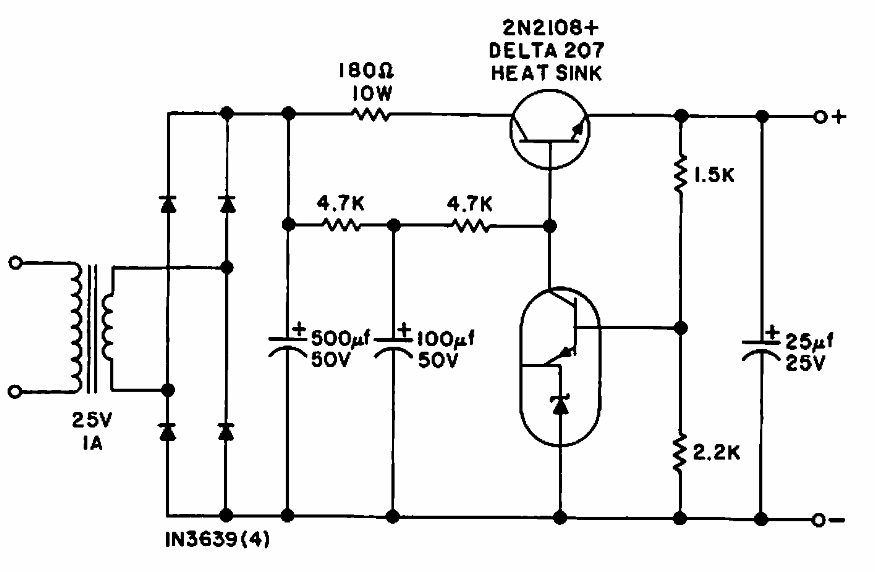 Esta pequena fonte regulada foi encontrada numa documentação da General Electric de 1963. O transistor especial com diodo zener pode ser substituído por uma configuração discreta equivalente.