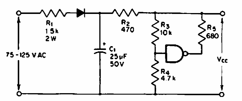 Encontrado numa EEE de 1970, este circuito fornece uma tensão de 12 V DC com corrente de 10 mA a partir da rede de energia. A porta NOR ou NAND usada é TTL.