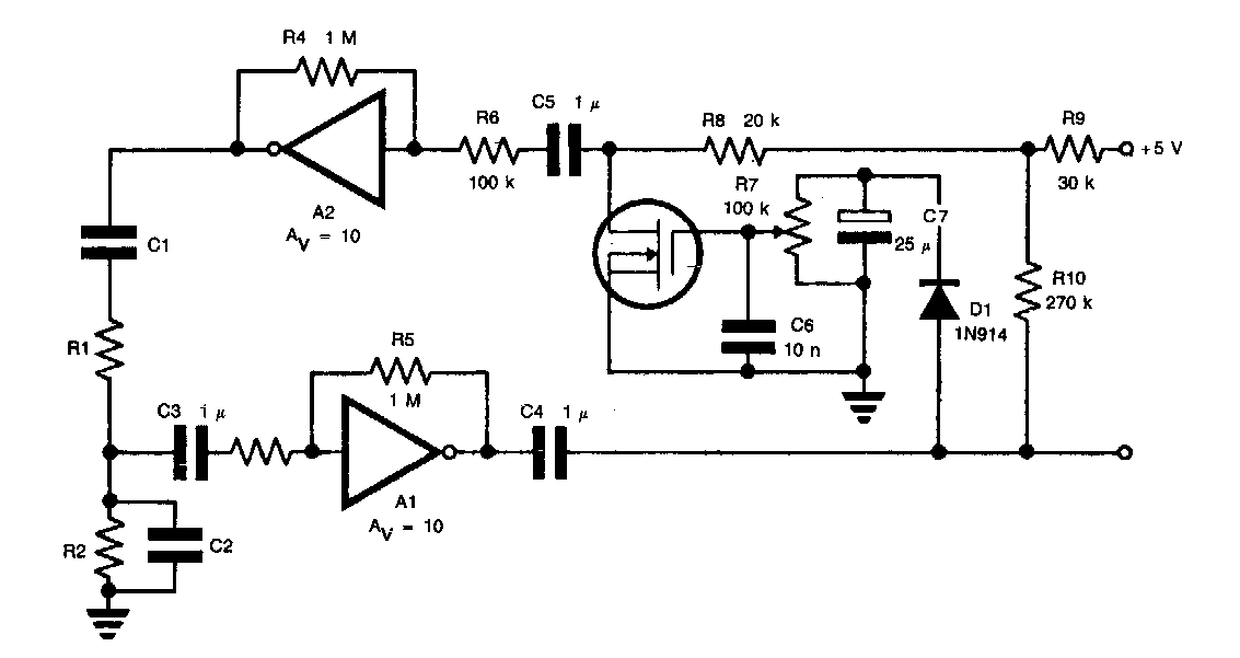 Este circuito foi encontrado numa Electronic Engineering dos anos 90. O sinal é senoidal com a frequência dada pelos componentes sem valor que formam a rede ressonante.