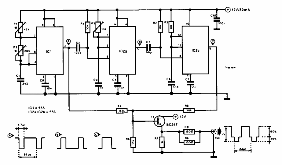 Este circuito é usado para gerar barras de padrão na tela de um televisor analógico para efeito de calibração. O circuito é de uma 303 Circuits dos anos 90.
