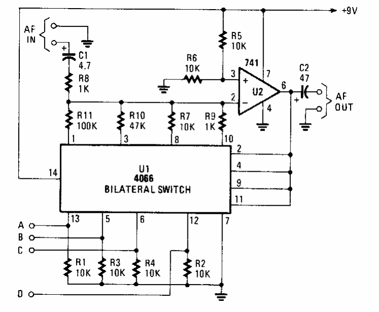 Este circuito foi encontrado numa Popular Electronics dos anos 90. Com ele, usando um 4066, é possível controlar entre menos de 1 a 100 o ganho de um amplificador operacional como o 741.