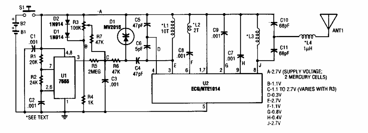 Este circuito foi encontrado numa Popular Electronics dos anos 90. O circuito opera na faixa determinada por L1. O circuito integrado usado é pouco comum atualmente.