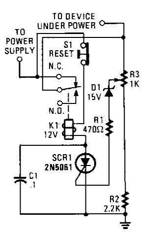 Encontrado numa Popular Electronics dos anos 90, este circuito dispara um relé em caso de sobretensão. Pode ser usado como circuito de proteção para fontes de alimentação.