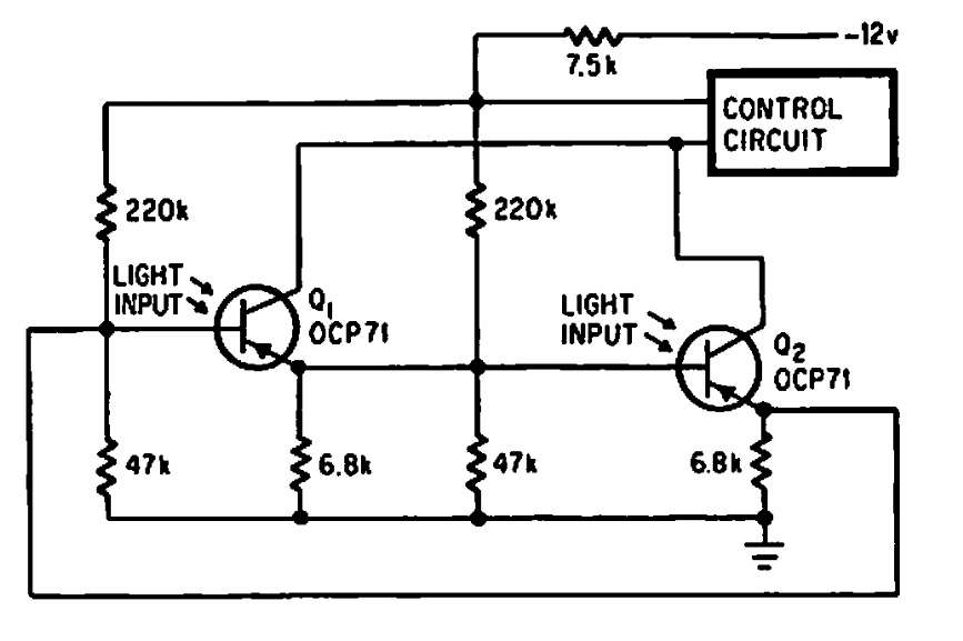 Encontrado em publicação americana de 1967, este circuito com feedback para dois transistores tem um ganho de 20 vezes. Os fototransistores são tipos da época.