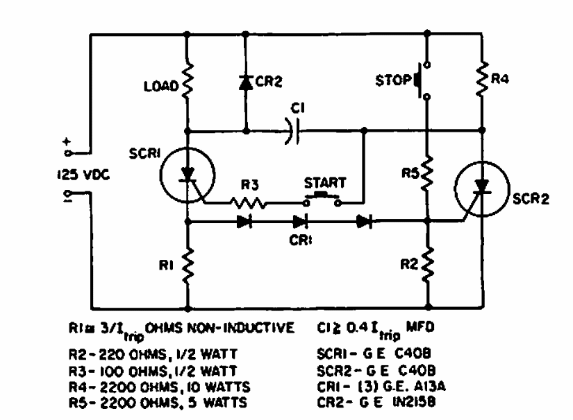 Encontrado num manual de SCRs da General Electric de 1967, este circuito pode ser usado na proteção de uma carga, comutando no caso de excesso de corrente. R1 determina a corrente de disparo.