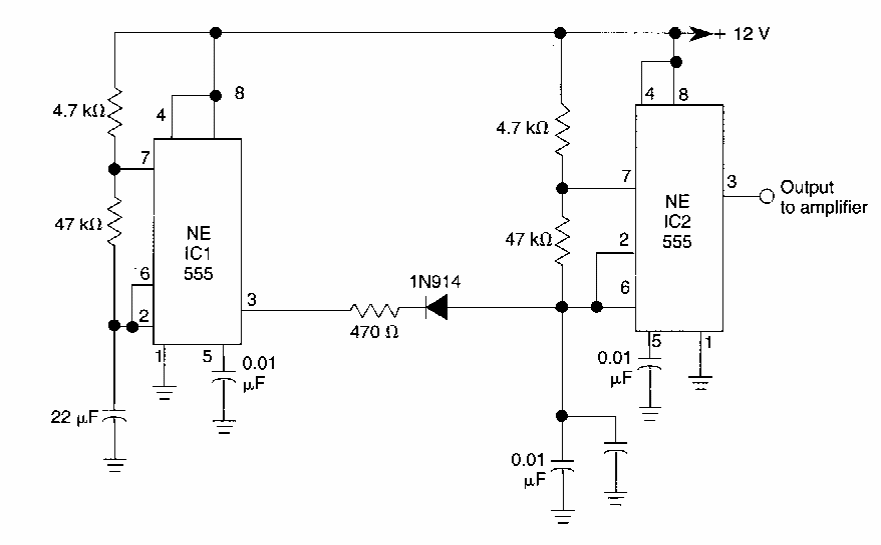 Usando os circuitos integrados 555, este circuito de alarme foi encontrado numa documentação americana dos anos 90. O sinal deve ser aplicado a um bom amplificador de áudio.