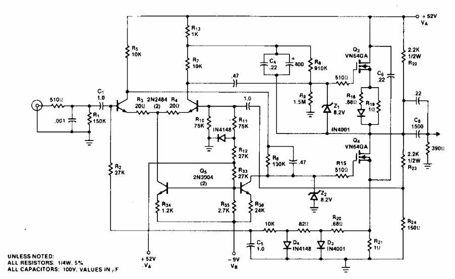 Este circuito com MOSFETs de potência foi encontrado em documentação da Siliconix dos anos 80. MOSFETs equivalentes podem ser usados, assim como os demais transistores. Observe a fonte simétrica.