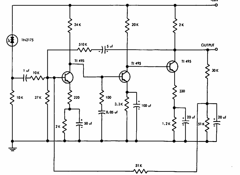 Este circuito é de uma documentação da Texas Instruments de 1968. Os componentes são da época e o fotodiodo sensor é difícil de obter atualmente. O circuito tem resposta de 10 Hz a 20 kHz.