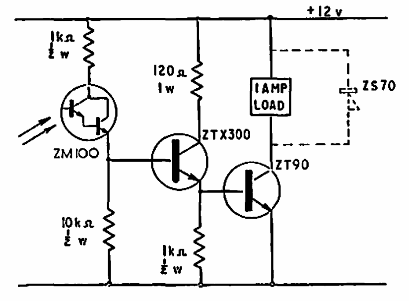 Encontrado em documentação da Ferranti de 1968, este circuito pode ser implementado com semicondutores equivalentes modernos. Com os componentes indicados a carga pode ser uma lâmpada até 1 A.
