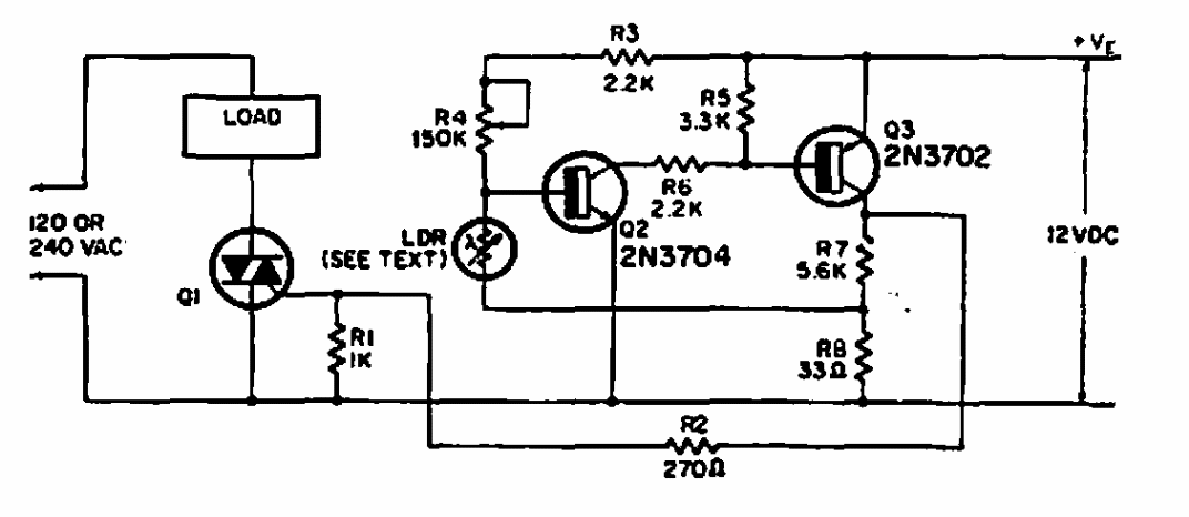 Este circuito foi encontrado numa Radio Electronics dos anos 60. O circuito usa componentes da época. O triac é de acordo com a carga controlada. O sensor é um LDR comum.