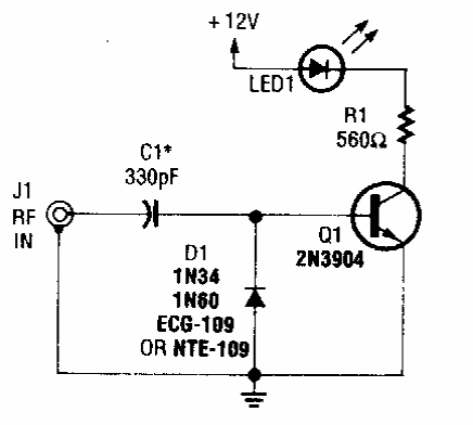 Este circuito foi encontrado numa Popular Electronics dos anos 90. O circuito indica se um transmissor está funcionando, monitorando seu sinal.