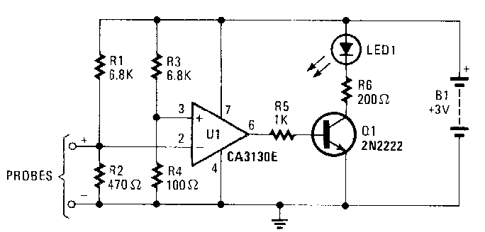 Este teste de continuidade foi encontrado numa Popular Electronics dos anos 90. O circuito aplica uma tensão de 300 mV no componente ou circuito em teste.