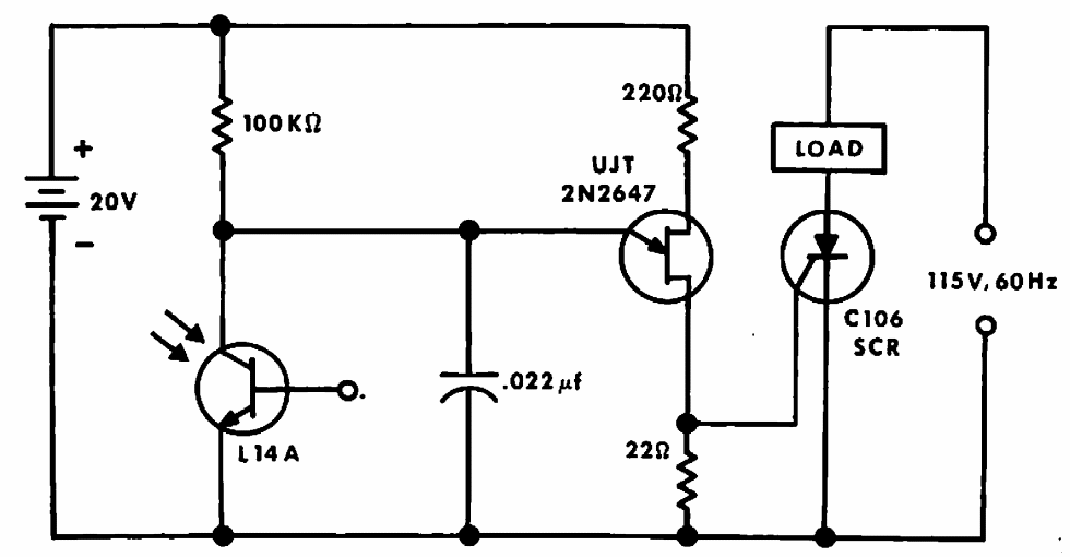 Este sensor de luz de alta sensibilidade foi encontrado numa documentação da General Electric de 1970. O circuito pode usar o 2N2646 e o fototransistor pode ser de qualquer tipo.