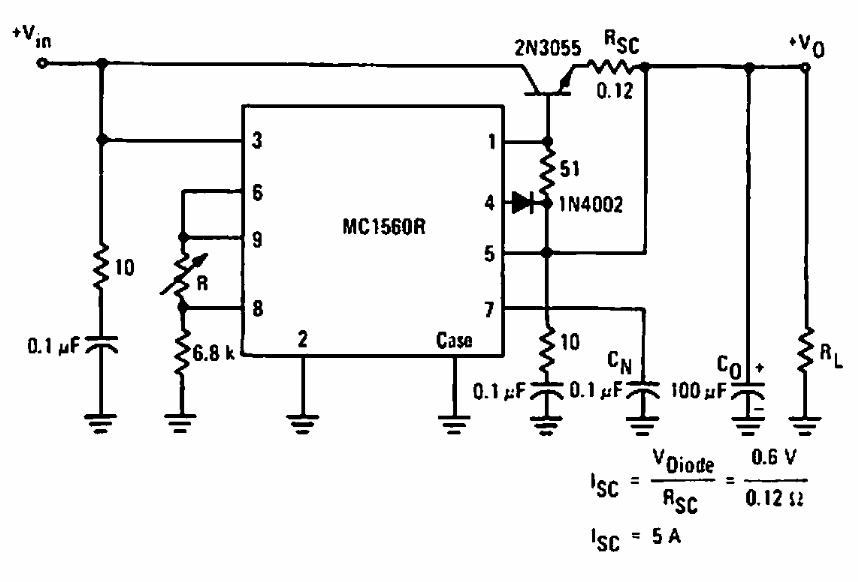 Este circuito regulador é de uma documentação da Motorola de 1969. Ele faz uso de um regulador integrado da época. Com o transistor indicado pode-se obter uma corrente até 5 A.