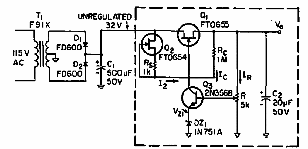 Encontrado numa EEE este circuito usa FETs da época e um bipolar. Transistores equivalentes atuais podem ser usados.