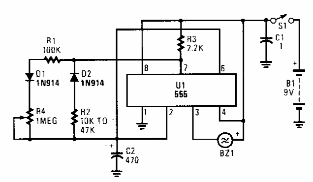 Indicado para aplicações duplas, este timer foi encontrado numa Popular Electronics dos anos 90. O circuito aciona um buzzer com oscilador.