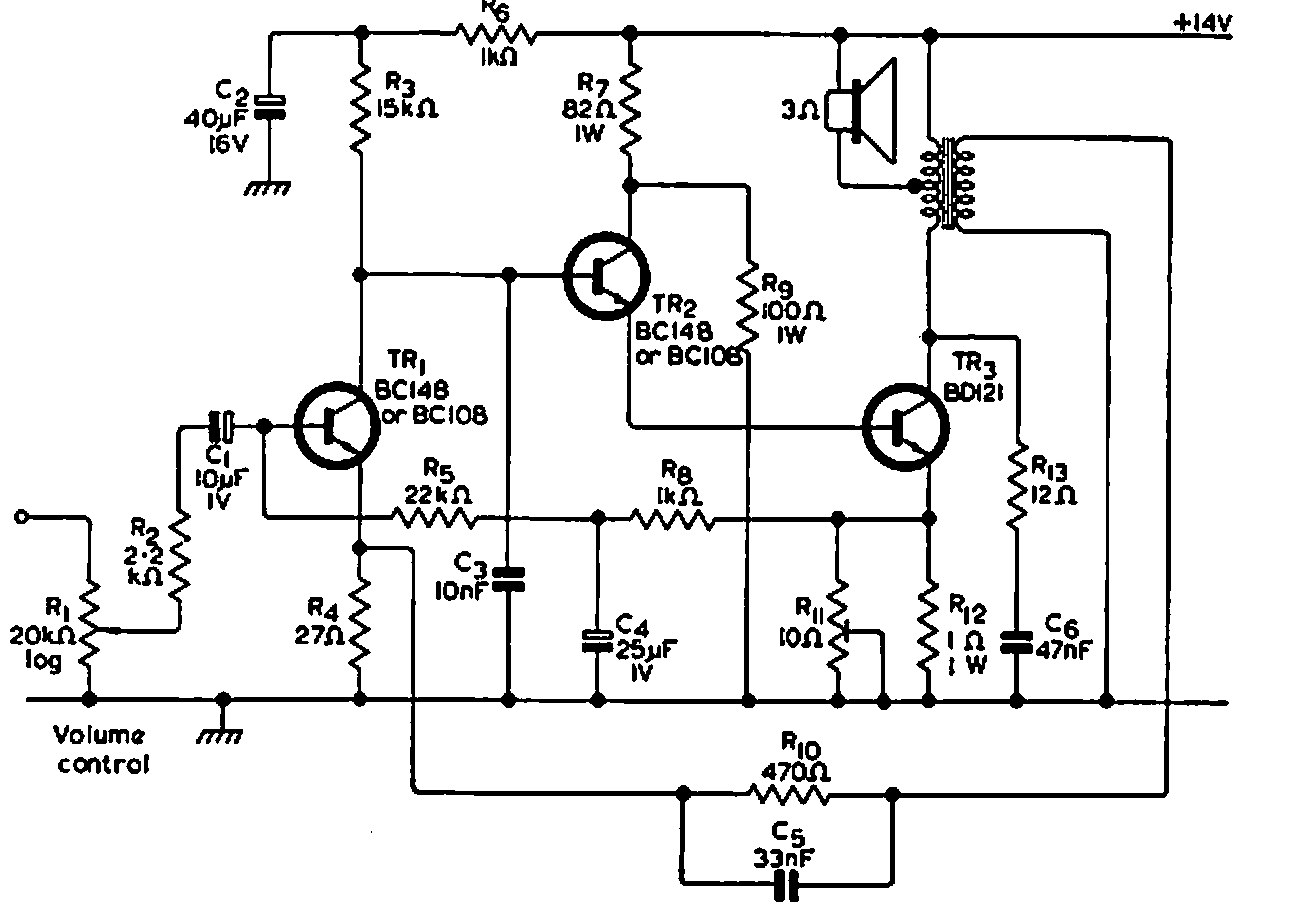 Este amplificador transistorizado de 5 W para o carro foi encontrado em uma documentação inglesa de 1969. Os transistores são da época e o transformador é de tipo especial.