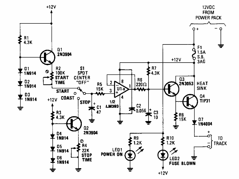 Encontrado numa Popular Electronics dos anos 90, este circuito pode alimentar uma ferrovia miniatura com tensões de 15 V e correntes até 1 A. O circuito tem efeitos de partida suave.